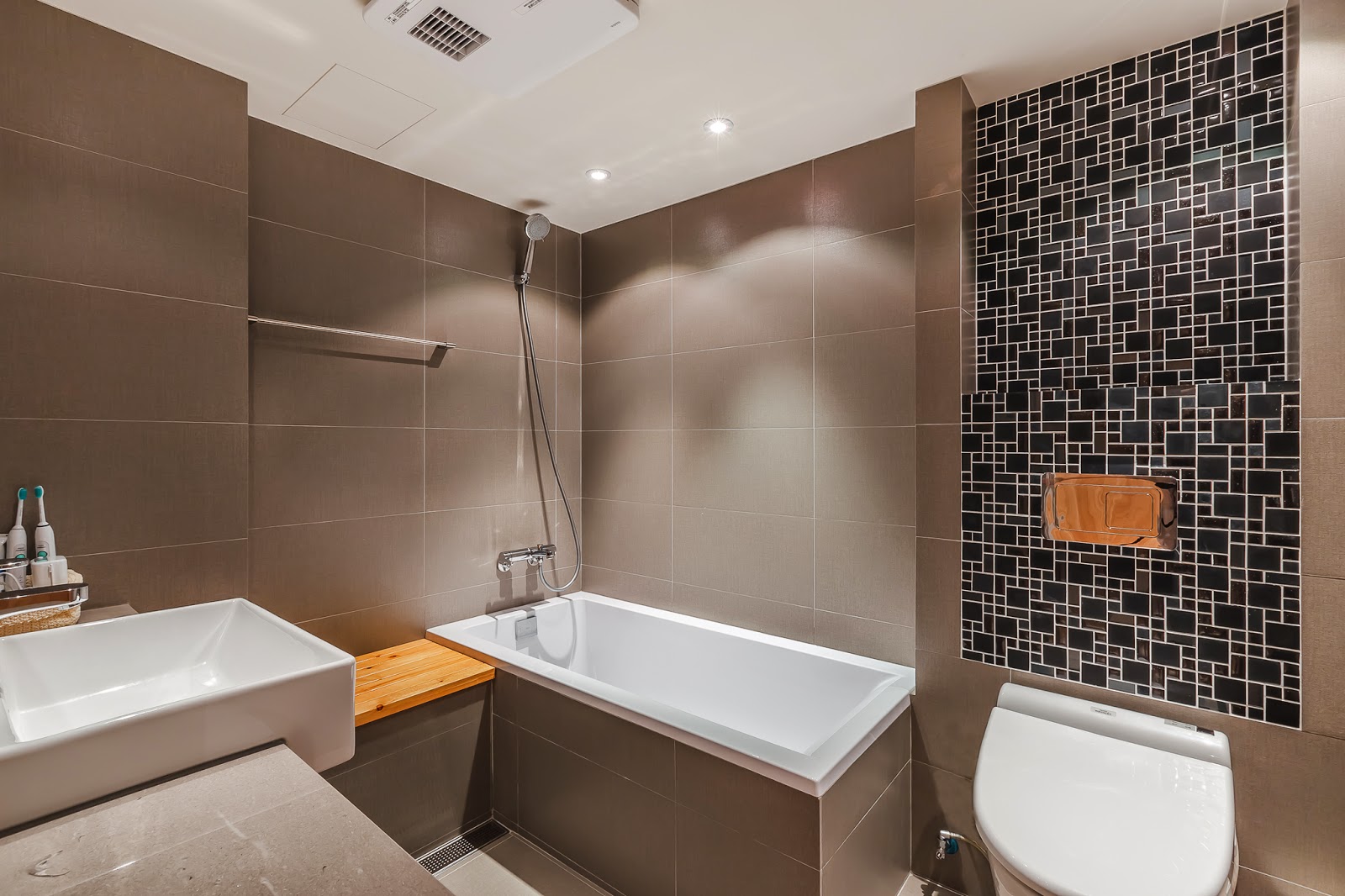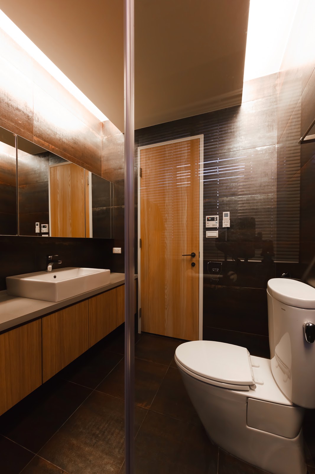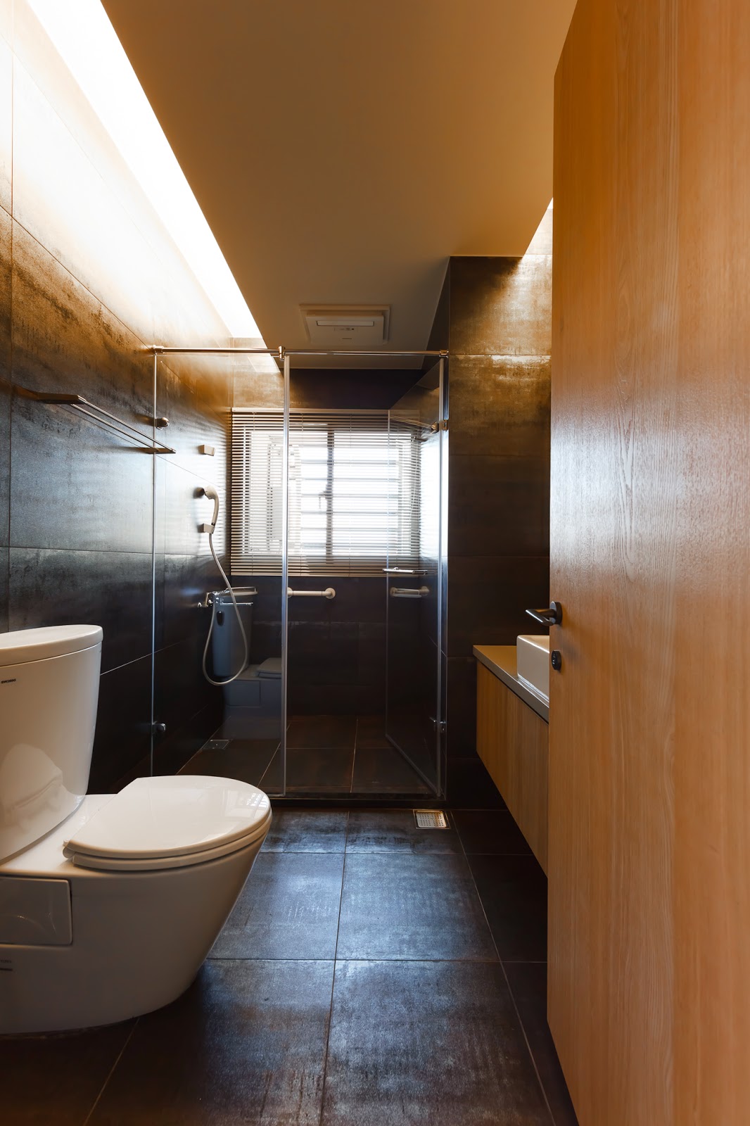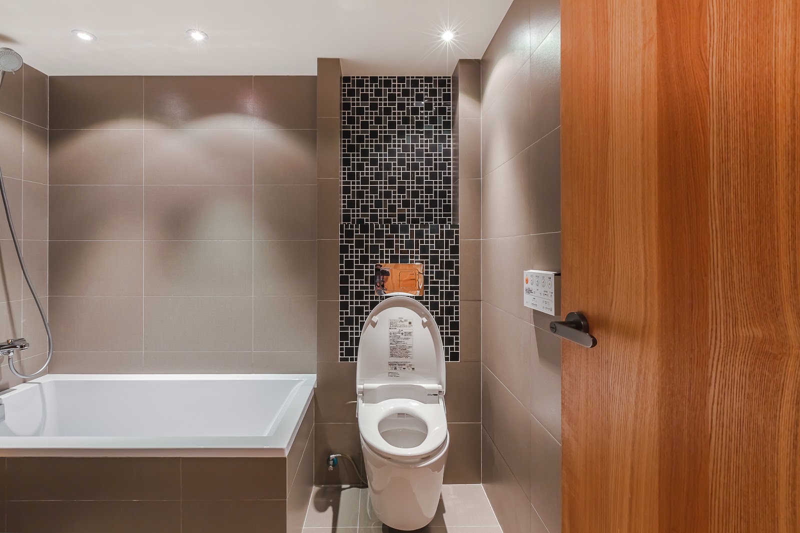 主臥室衛浴 馬桶後方採用馬賽克磁磚增添設計感 馬桶採用TOTO隱蔽水箱式馬桶(壁掛),優點是簡省空間並展現簡約風 |