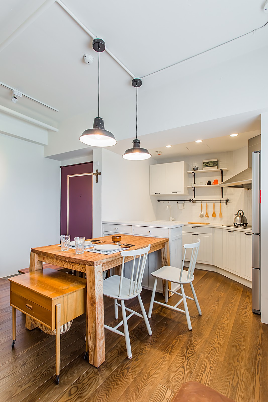 此次案件大量採用木作材質、陳年老舊材料,搭配特殊油漆方式,刷出髒舊風格,搭配無印良品的家具、懷舊風吊燈與特別訂製的木作餐桌,營造出日系復古風格。