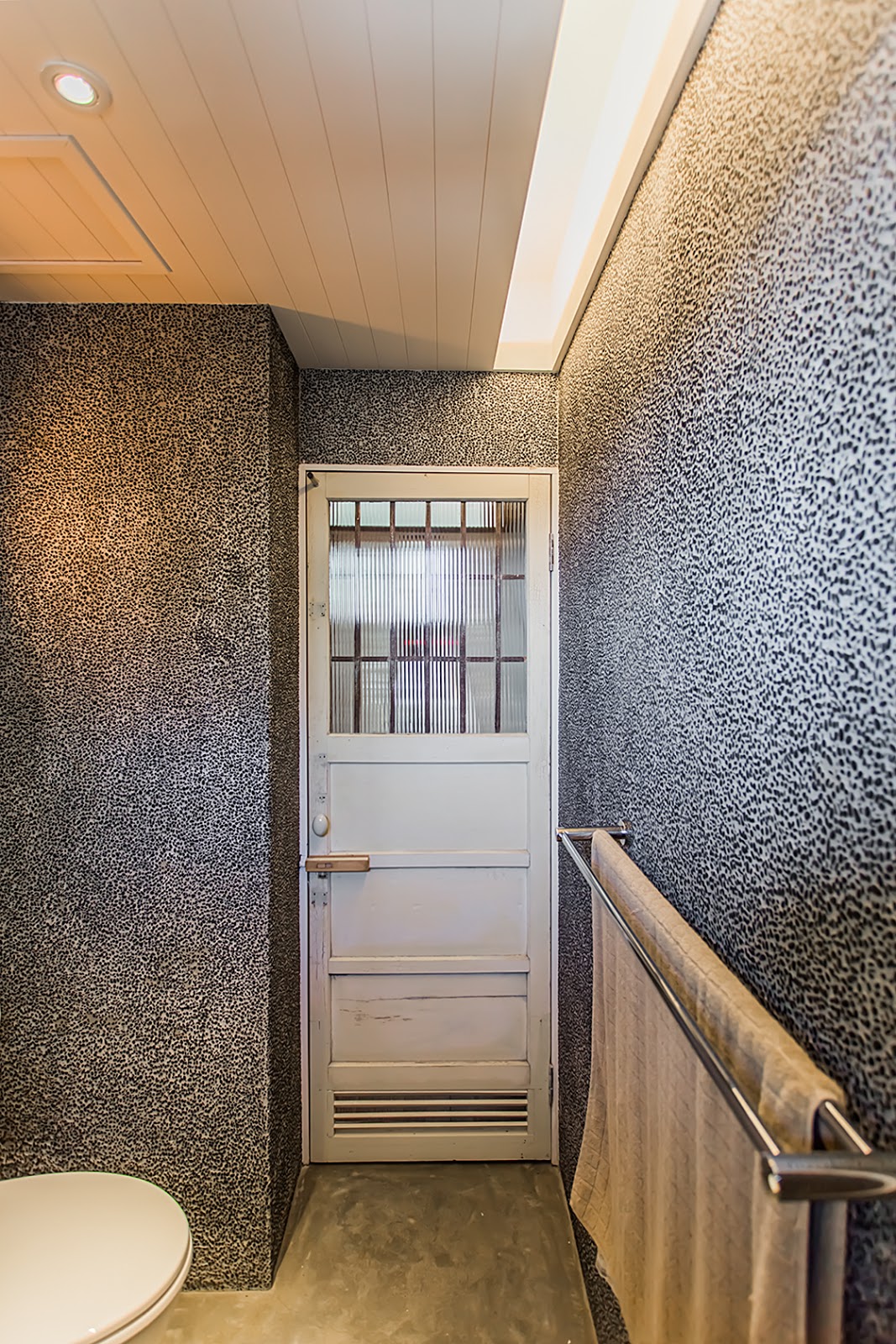 廁所使用洗石子搭配清水模地板,最特別的是廁所門還是從舊木材料行挖到的!!