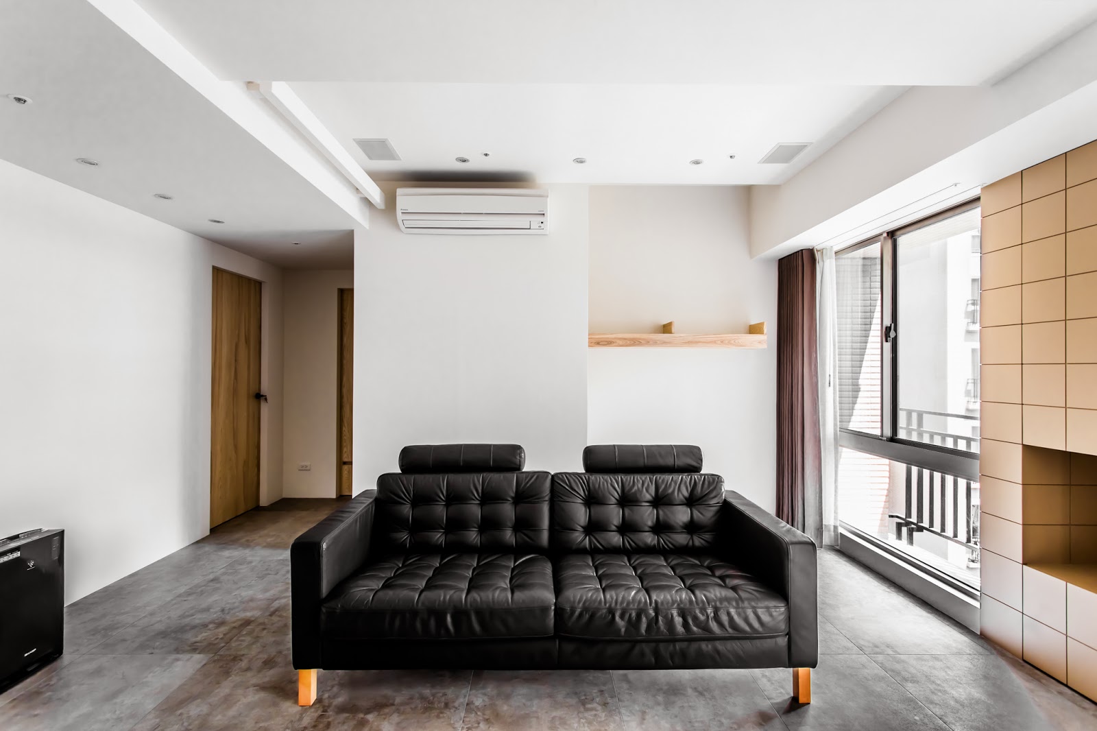 主要建材:木紋 : 水曲柳木自然拼貼 / 地板 : 清水模磁磚、橡木海島型木地板 / 鐵件/ 馬鞍皮